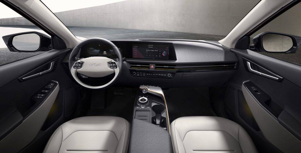 فضای داخلی بسیار متفاوت از Ioniq 5 است که بازتر و قابل تنظیم تر است و دارای داشبرد مستطیلی شکل است. ششمین خودرو برقی کیا از یک اهرم انتخاب دنده روی داشبورد یا کنسول چشم پوشی می کند ، در عوض دکمه انتخاب دنده را روی کنسول مرکزی انتخاب می کند ، که به نظر می رسد دکمه روشن بودن ماشین را نیز در خود جای داده است. برای دسترسی آسان به کنترل ها ، فرمان دارای چندین کلید است.